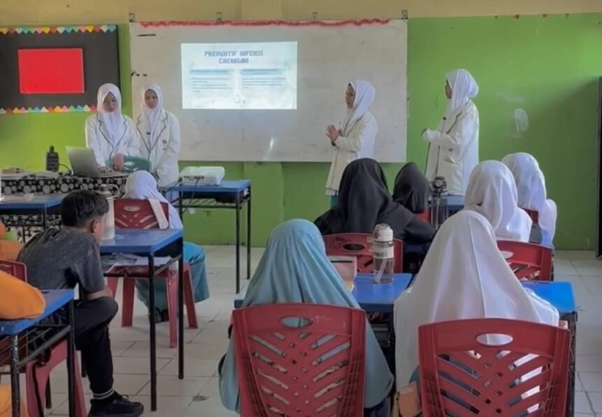 Radarnews.co, PEKANBARU – Lima siswi Sekolah Menengah Kejuruan (SMK) Abdurrab Pekanbaru melaksanakan kegiatan penyuluhan kesehatan bertema “Pola Hidup Sehat Tanpa Parasit” di Madrasah Tsanawiyah (MTs) Hasanah, Jalan Cempedak, Jumat (17/10/2025) pagi.